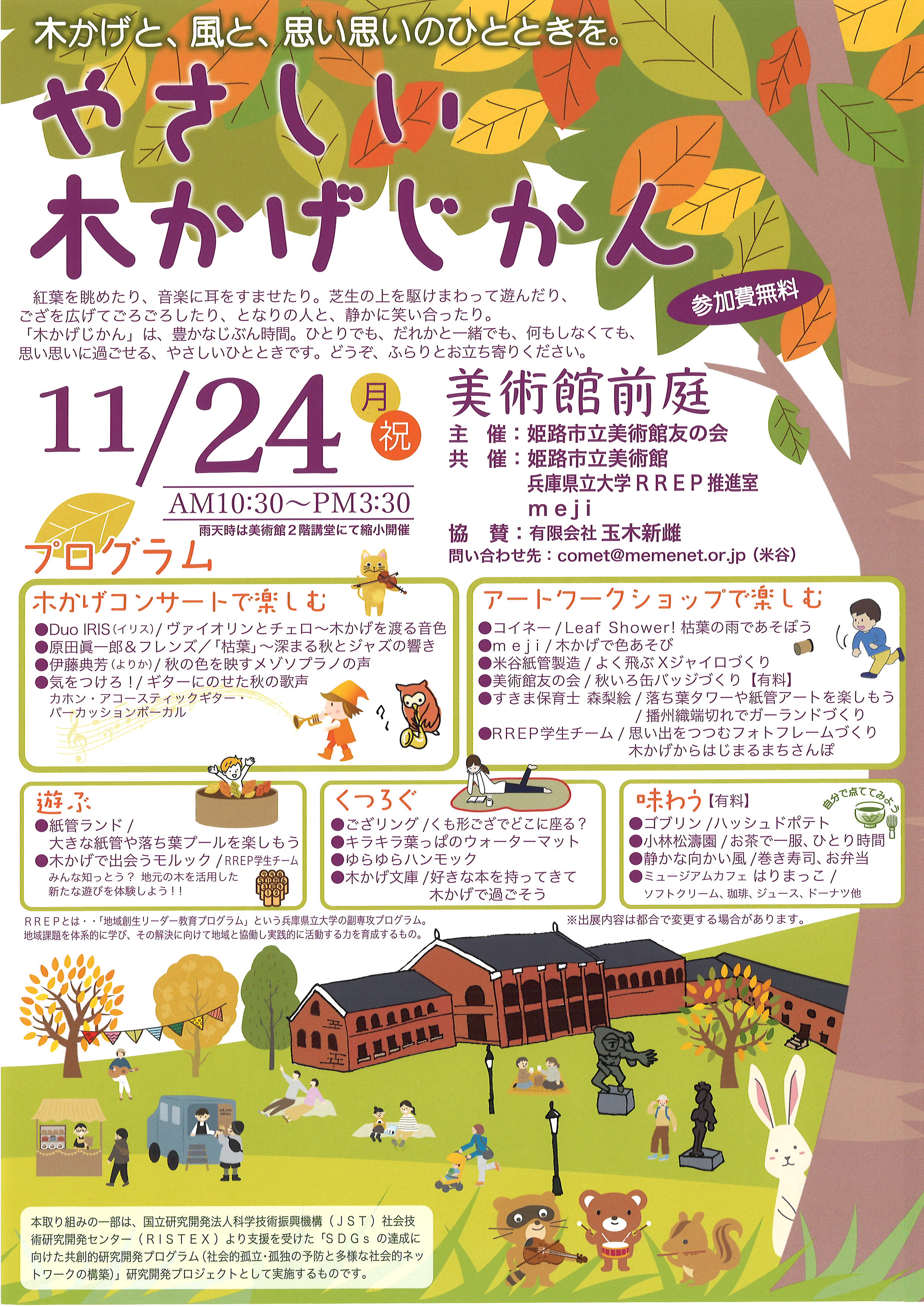 11月24日に姫路市立美術館前庭で「やさしい木かげじかん」が開催されます。